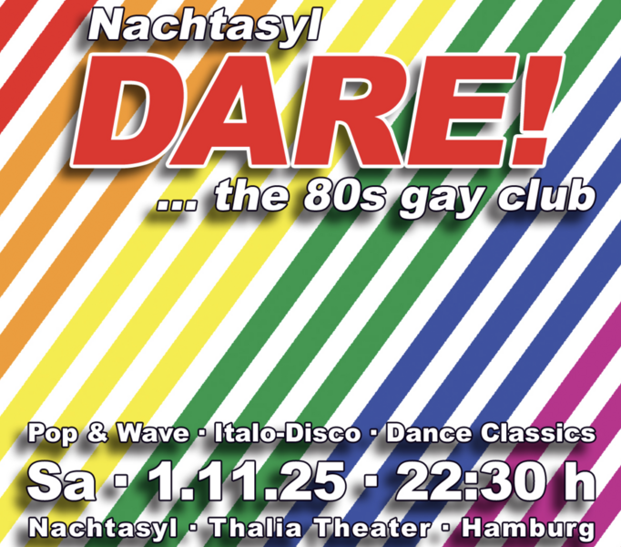 Am 1. November 2025 zelebrieren wir wieder das beste aus den 1980er Jahren: Pop & Wave, Italo Disco und Dance Classics - alles was die Gays seinerzeit auf die Tanzflächen trieb.